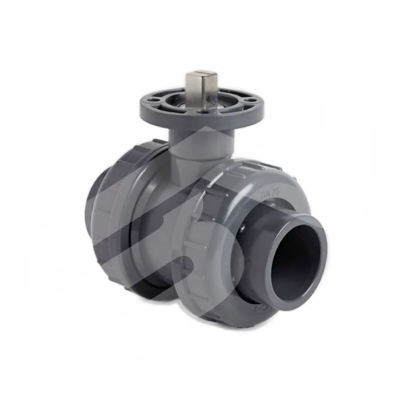 The Challenger PVC Imperial ISO Top Ball Valves feature an FPM seal and are designed for solvent weld connections. This 1" U-PVC Plain Excel Ball ISO Top Double Union Ball Valve is equipped with an ISO top, allowing for actuator attachment directly without extra brackets, enhancing its utility and efficiency in valve applications.