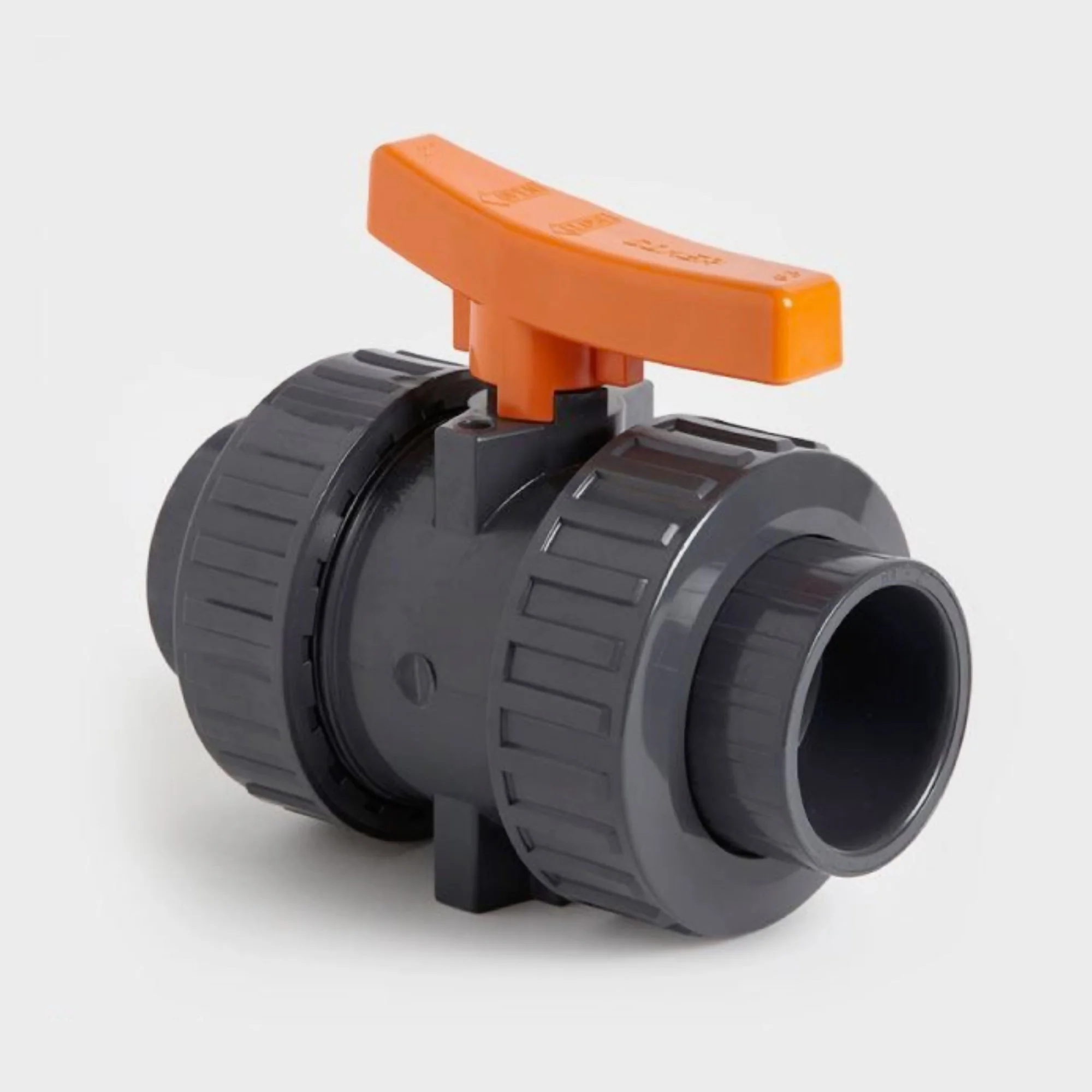 Double union PVC metric industrial ball valves are important components used in various industrial applications where precise control over fluid flow is needed. These valves are built to be durable, reliable, and high-performing, making them suitable for industries like chemical processing, water treatment, irrigation, and more. Made from quality PVC material, these ball valves resist corrosion, chemicals, and abrasion well, ensuring they remain functional for the long term even in tough environments.