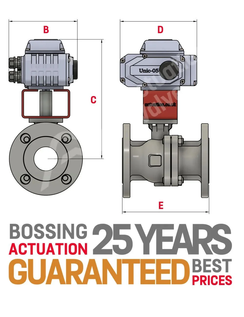The BV-L6N00EK DIN PN40 actuated ball valves, designed for high-pressure, full-flow operations, can accommodate bores up to 8 inches. These valves are structured to be fitted between two different flanges in a pipeline. They come with certifications from DNV, SIL 2, Lloyds Register, and are compliant with NACE MR-0175 standards. Options for these ball valves include a drilled upstream and cavity relief hole in the ball, as well as a high-temperature spindle extension suitable for insulation and steam actuation. Rapid delivery is available, ensuring arrival within 24-48 hours for in-stock components. The Koei UNIC Electric Actuator is equipped with an Allen Key Manual Override for ease of use, an overload protection system, and an electric stop at the end of travel. Additionally, it incorporates a mechanical limit/mechanical switch, facilitating open and close status indications on your control panel.